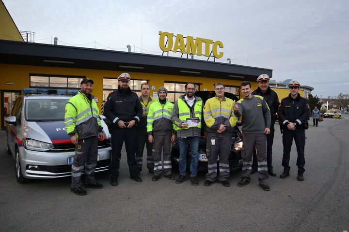 Eisenstadt: V.l.n.r. – Gernot Schrödl (ÖAMTC), Polizist Christian, Patrick Müllner (ÖAMTC), Markus Tanzer (ÖAMTC), Robert Lackner (ÖAMTC), Daniel Schumich (ÖAMTC), David Wagner (ÖAMTC), Polizist Gerhard, Polizist Sebastian