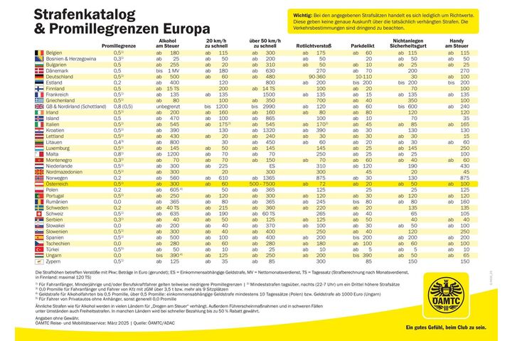 * Alkohol am Steuer: "Wer unter Alkoholeinfluss fährt, riskiert nicht nur die Sicherheit für sich und andere Verkehrsteilnehmer:innen sondern auch drastische Strafen", betont die ÖAMTC-Rechtsexpertin. "In Italien wird das Fahrzeug beschlagnahmt, wenn der:die Fahrer:in mit 1,5 Promille oder mehr unterwegs ist und auch als Eigentümer:in eingetragen ist." Wer in Spanien mit 1,2 Promille am Steuer erwischt wird, muss mit bis zu drei Monaten Freiheitsstrafe rechnen. Ab 0,5 Promille muss man in Deutschland und Spanien mit einer Geldstrafe ab 500 Euro, in Italien ab 545 Euro rechnen.