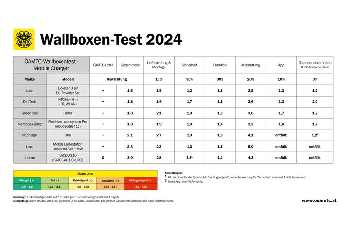 Zwei Mal jährlich testen der ÖAMTC und seine Partnerclubs Wallboxen für das Laden von Elektroautos. Im ersten Test 2024 wurde der Schwerpunkt auf mobile Ladeeinrichtungen gelegt, sogenannte "Mobile Charger". Sie können flexibel an wechselnden Orten (beispielsweise am Zweitwohnsitz) an vorhandene Steckdosen angeschlossen werden. Im aktuellen Test wurden sieben Modelle hinsichtlich Sicherheit, Ausstattung, Funktion und App getestet. "Der Test zeigt, dass sich mobile Ladeeinrichtungen nicht hinter den fest installierten Wallboxen verstecken müssen. Sechs der sieben Exemplare sind 'gut', eines 'befriedigend' – die Unterschiede liegen im Ausstattungsumfang und dem Preis, der von ca. 200 bis 1.500 Euro reichen kann", resümiert ÖAMTC-Techniker Florian Merker. Nervige Ladeabbrüche, die im schlimmsten Fall ein nicht geladenes Auto zur Folge haben, gehören ebenso der Vergangenheit an wie Sicherheitsmängel der verbauten Abschalteinrichtungen bei Fehlerströmen. Näheres unter www.oeamtc.at/tests.