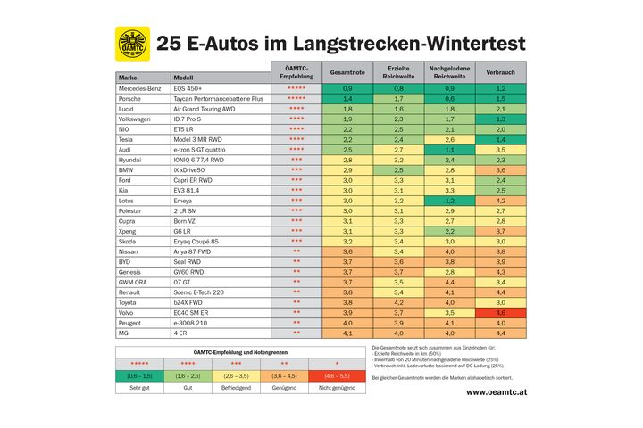 Mangelhafte Langstreckentauglichkeit im Winter wurde bei keinem der getesteten Fahrzeuge festgestellt: Mit allen Autos kann unter den herausfordernden Testbedingungen mindestens zwei Stunden gefahren werden, bevor ein Ladestopp nötig wird - daher wurde auch kein Kandidat mit “nicht genügend” bewertet. “Genügend” gab es hingegen mehrere, wie Christian Klejna erklärt: “Bei einigen Fahrzeugen war der Verbrauch mit rund 30 kWh/100 km so hoch, dass auf der simulierten Teststrecke dreimal nachgeladen werden musste, um das Ziel zu erreichen. In diese Kategorie fallen u. a. der Volvo EC40 SM ER, der Peugeot e-3008 Version 210 und - als Schlusslicht - der MG 4 ER, bei dem vor allem die Schwächen im Heizsystem den Verbrauch hochtreiben.”