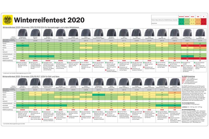 Der ÖAMTC und seine Partner haben 15 Winterreifen für Fahrzeuge der Kompakt- und unteren Mittelklasse (Dimension 205/55 R16 91H) und 13 für SUVs und Transporter (235/55 R17 103V) getestet. Friedrich Eppel, Reifenexperte des Mobilitätsclubs, fasst die Ergebnisse zusammen: "In der kleineren Dimension haben wir mit fünf 'sehr empfehlenswert' und sieben 'empfehlenswert' ein sehr positives Gesamtergebnis. Bei den 235ern sind die Noten zwar alles in allem ebenfalls gut, verteilen sich aber anders – hier steht ein 'sehr empfehlenswert' gleich elf 'empfehlenswert' gegenüber." Besonders auffällig: Schwächen auf trockener Fahrbahn verhindern bei vielen Reifen beider Dimensionen ein besseres Ergebnis.