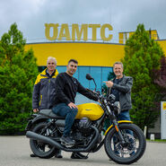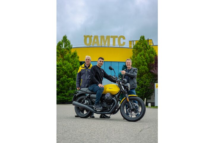 V.l.n.r.: Georg Scheiblauer (Leiter ÖAMTC Fahrtechnik Zentrum Teesdorf); Gewinner der Moto Guzzi V7 Stone; Hubert Freiler (Leiter Marketing Faber GmbH)