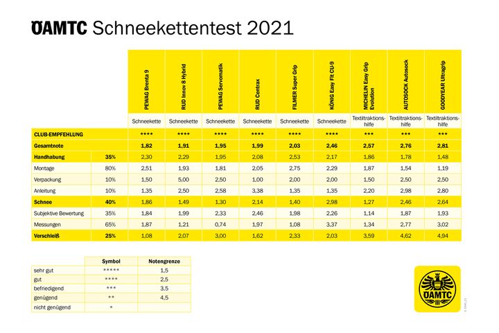 Das Fazit von ÖAMTC-Techniker Steffan Kerbl: "Auch wenn keines der neun getesteten Modelle die Bestnote 'sehr gut' erreicht hat, gibt es mit sechs 'gut' und drei 'befriedigend' ein positives Gesamtergebnis. Überrascht hat uns, dass die textilen Anfahrhilfen der Leistung einer Schneekette in nichts nachstehen, wenn es um die Kraftübertragung beim Anfahren geht. Im Gegenteil, gerade in diesem so wichtigen Kriterium hat mit der Michelin Easy Grip ein textiles Produkt die Nase vorn." Und auch in Sachen (De-)Montage und Handhabung haben Michelin Easy Grip, Autosock und Goodyear Ultragrip Vorteile gegenüber herkömmlichen Schneeketten.