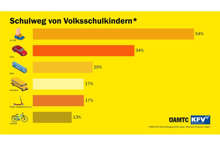 Im Jahr 2024 verunglückten in Österreich 451 Kinder an Schulwegen. Eine von Ipsos im Auftrag von ÖAMTC und KFV im Frühjahr 2025 durchgeführte repräsentative Online-Befragung unter 600 Eltern von Volksschulkindern informiert zum Mobilitätsverhalten der 6- bis 10-Jährigen. Sie zeigt aber auch Probleme bei der Gefahrenwahrnehmung und beim Unfallgeschehen sowie klare Lösungsansätze und ein hohes Potenzial für elterliches Engagement auf. "Fast ein Drittel der Eltern sieht große Schwierigkeiten am Schulweg – 31 Prozent durch hohes Verkehrsaufkommen, 18 Prozent durch unübersichtliche Kreuzungen, 17 Prozent durch fehlende Zebrastreifen und 16 Prozent durch Ablenkung", so ÖAMTC-Verkehrspsychologin Marion Seidenberger. Bezüglich Regelwissen sind die Kinder laut Eltern-Einschätzung top. Handynutzung als Ablenkungsursache wird unterschätzt.
