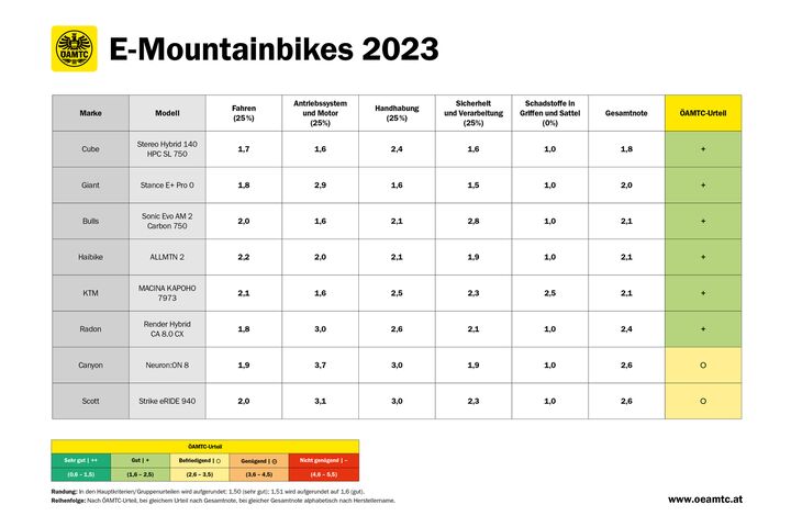 Der Trend zum Elektrofahrrad ist ungebrochen – und macht auch vor geländegängigen Mountainbikes nicht halt. Der ÖAMTC und seine Partnerorganisationen haben daher acht aktuelle Modelle getestet, mit durchwegs zufriedenstellenden Ergebnissen, wie ÖAMTC-Techniker Steffan Kerbl erklärt: "Sechs der Räder wurden mit 'gut', zwei mit 'befriedigend' beurteilt. Die Unterschiede haben allerdings wenig mit den Fahreigenschaften zu tun, sondern erklären sich eher aus Nuancen in der Bauweise und beim E-Antrieb." Untersucht wurden ausschließlich vollgefederte E-Mountainbikes, die zum Zeitpunkt der Testkäufe (im November 2022) für unter 5.000 Euro zu haben waren.