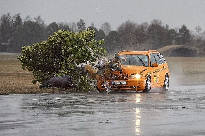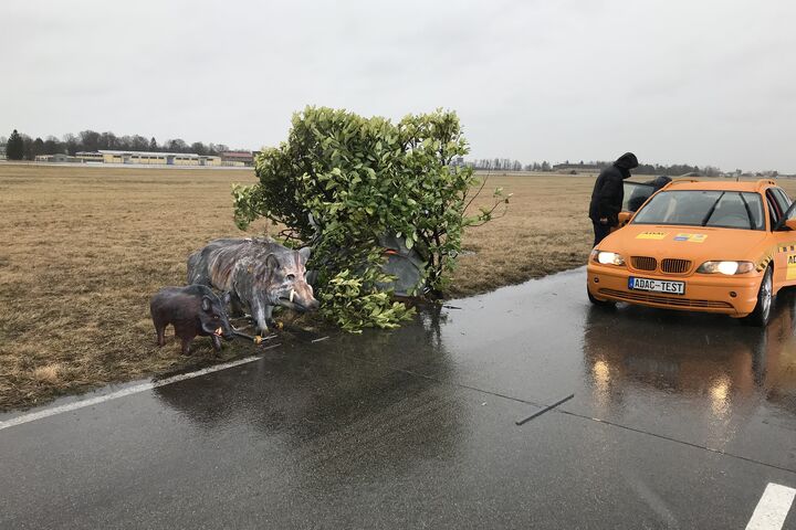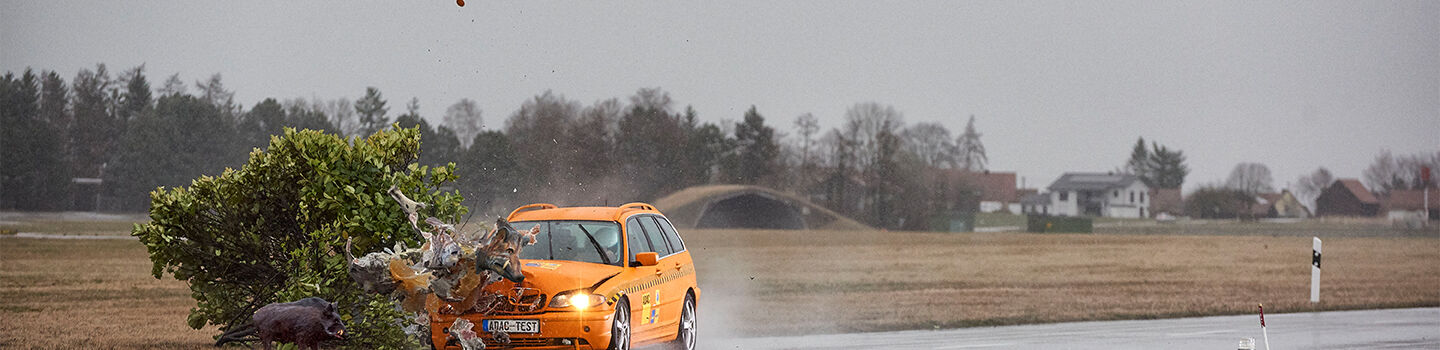 Der Mobilitätsclub führte gemeinsam mit seinen Partnerclubs einen Crashtest mit einem realistisch nachgebildeten, 180 kg schweren Wildschweinkeiler durch. Das Ergebnis zeigt, dass bei entsprechenden Unfällen bei 80 km/h kurzzeitig eine Kraft auf die Insassen einwirkt, die dem zehnfachen Körpergewicht entspricht.