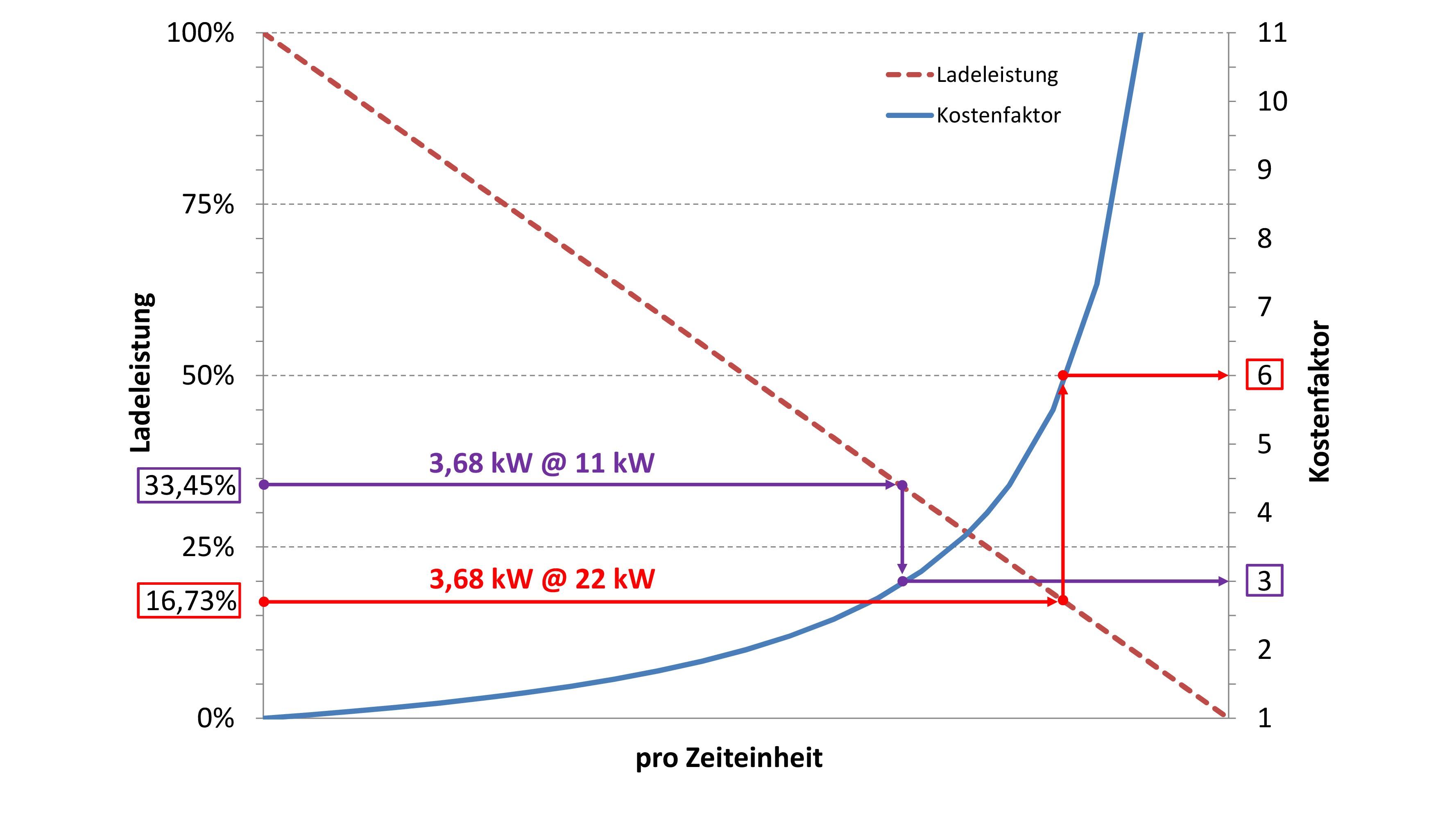 Der in Abbildung 1 gezeigte Verlauf des Kostenfaktors in Abhängigkeit der jeweils momentanen Ladeleistung zeigt das Verhältnis zwischen einem eintretenden Ladeleistungsabfall und dem zugleich starken Anstieg des tatsächlichen Energiepreises bei einem Zeittarif. Fällt die Ladeleistung aufgrund zu geringer Temperaturen in den Akkuzellen geringer aus oder nimmt ab Erreichen eines fahrzeugspezifischen Ladezustandes allmählich ab, erhöht sich der umgerechnete Energiepreis. Dieser wird anhand eines Kostenfaktors dargestellt. Herrschen optimale Ladebedingungen und die Ladeleistung kann zu 100 % vom Fahrzeug aufgenommen werden, beträgt der Kostenfaktor 1.