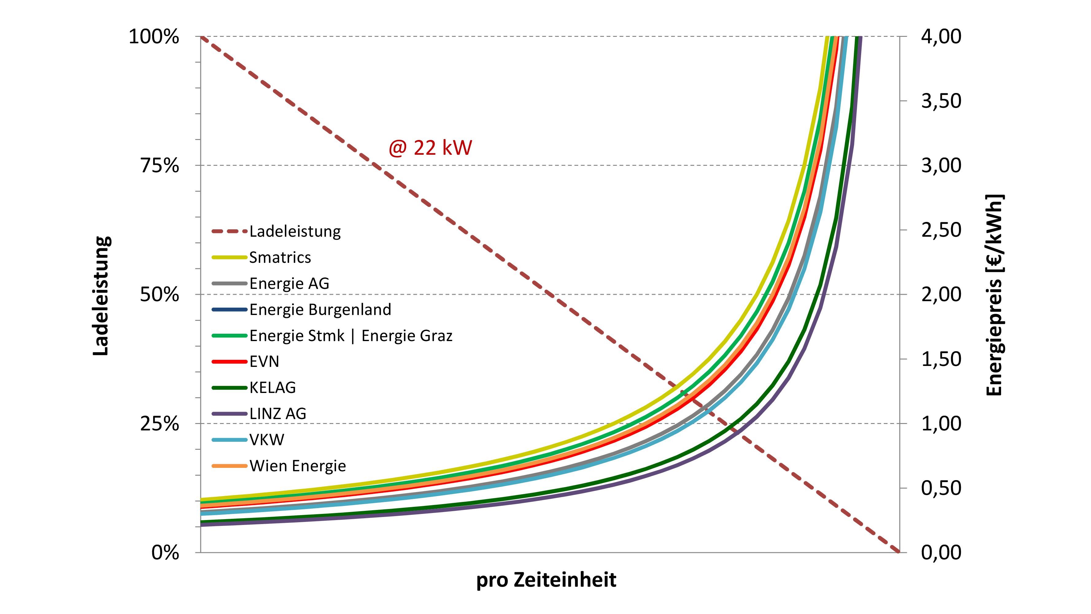 Anhand der beiden daneben gezeigten Energiepreiskurven in Abbildung 2 sowie Abbildung 3 wird der Einfluss der Ladebedingungen auf das Ladeverhalten und somit auch auf den sich ergebenden Energiepreis bei vorliegendem Zeittarif dargestellt. Diese Energiepreisbetrachtungen in Abhängigkeit der Ladeleistung wurden von den Zeittarifen der genannten Ladeinfrastrukturbetreiber für sowohl 11 KW als auch 22 kW durchgeführt.