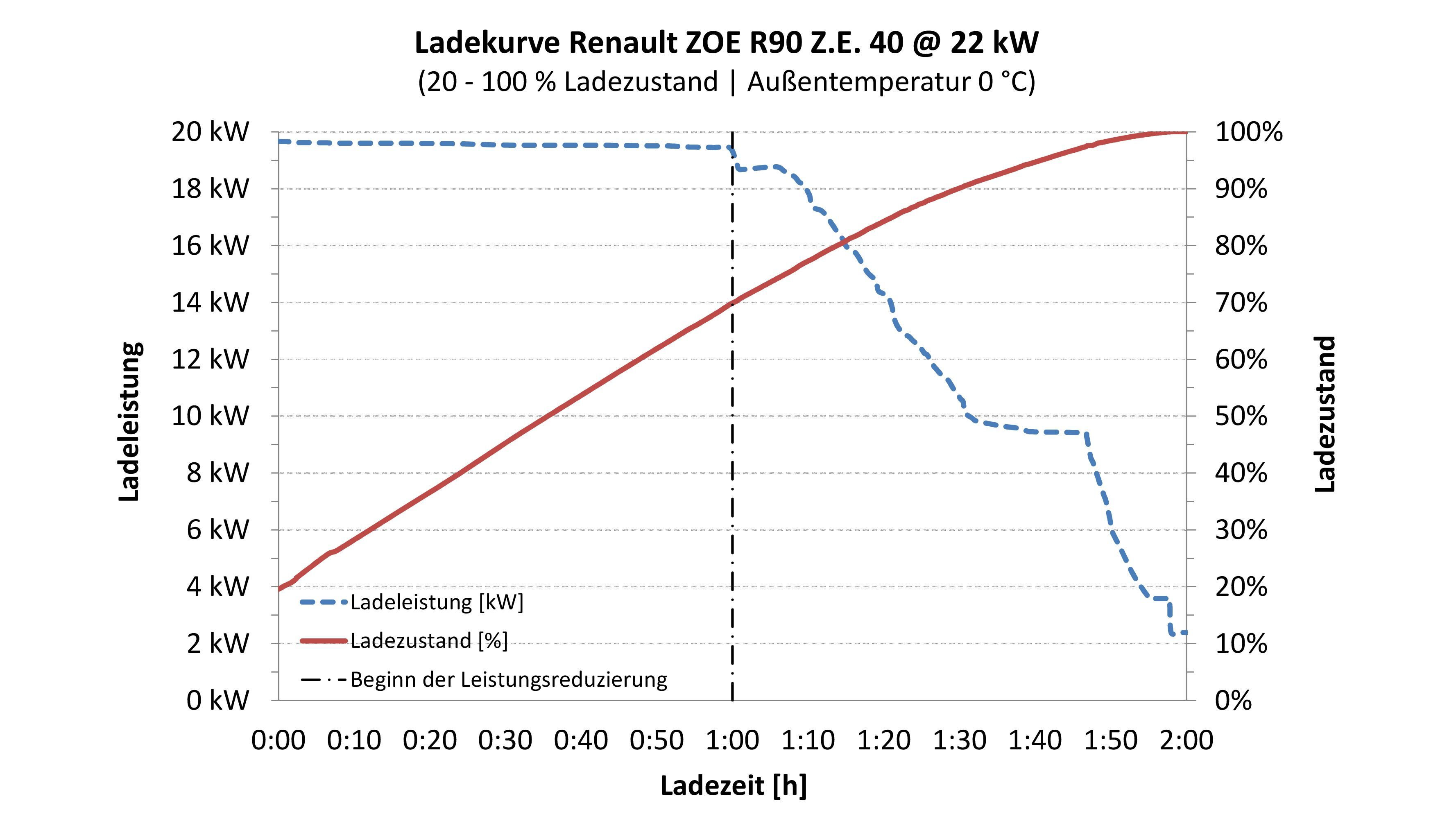 Als eines der wenigen Batterie-Elektrofahrzeuge am Markt kann der Renault ZOE an Wechselstrom mit bis zu 22 kW geladen werden, weswegen er für die Durchführung dieses Tests optimal geeignet war. Um eine möglichst vollständige Aufladung darzustellen, wurde die Ladung bei 20 % gestartet und bei Erreichen des Ladezustandes von exakt 100 % beendet. Zudem lag an dem Testtag eine nicht optimale Umgebungstemperatur von 0 °C vor.