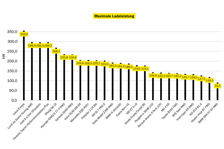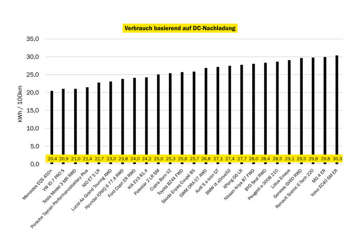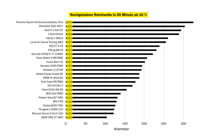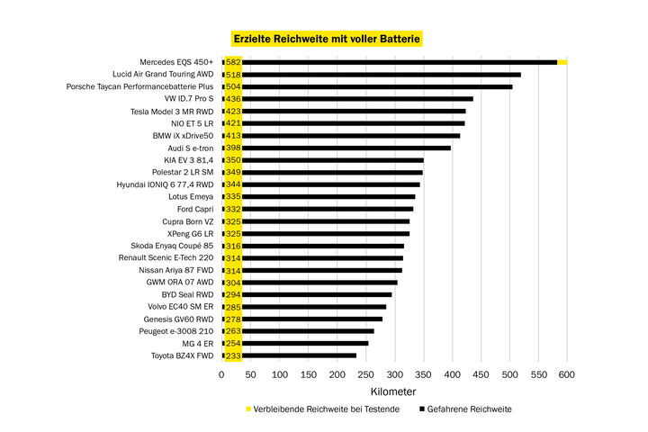Nur ein Fahrzeug, der Mercedes EQS 450+, schaffte die Gesamtstrecke mit einer einzigen Akkuladung. Bemerkenswert ist außerdem, dass bei diesem Auto in 20 Minuten über 300 Kilometer nachgeladen werden können. Und: Mit nur 20,4 kWh/100 km ist sein Langstreckenverbrauch so niedrig wie bei keinem anderen Fahrzeug im Test. Damit erhält die Oberklasse-Limousine ein “sehr gut” und ist klarer Testsieger, vor dem ebenfalls mit “sehr gut” bewerteten Porsche Taycan, der mit niedrigem Verbrauch (21,4 kWh/100 km) und ausgezeichneter Ladeleistung (370 Kilometer in 20 Minuten) punkten kann. Seine Reichweite bei vollem Akku: 504 Kilometer.