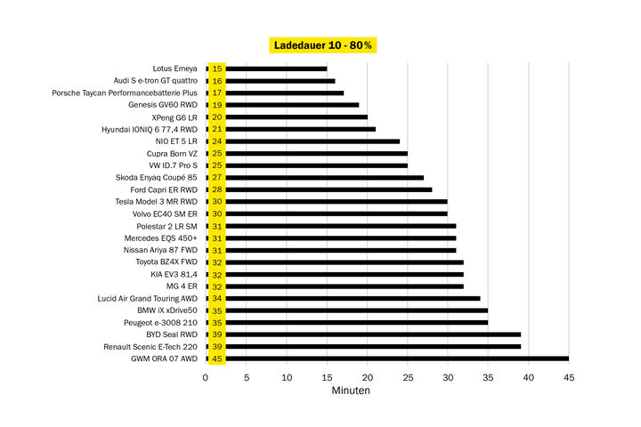 Mit “gut” wurden die Langstreckenmodelle von Lucid (Air Grand Touring AWD), VW (ID.7 Pro S), NIO (ET5 LR), Tesla (Model 3 MR RWD) und Audi (E-tron S GT quattro) bewertet. Der Tesla ist mit knapp 45.000 Euro eine vergleichsweise günstige Alternative, ähnliches gilt für die mit “befriedigend” beurteilten Cupra Born VZ und Skoda Enyaq Coupé 85. Unterm Strich schafft man mit dem Tesla die 580 Kilometer im Winter mit einem 20-minütigen Ladestopp, mit den anderen zwei Fahrzeugen braucht es zwei Stopps.
