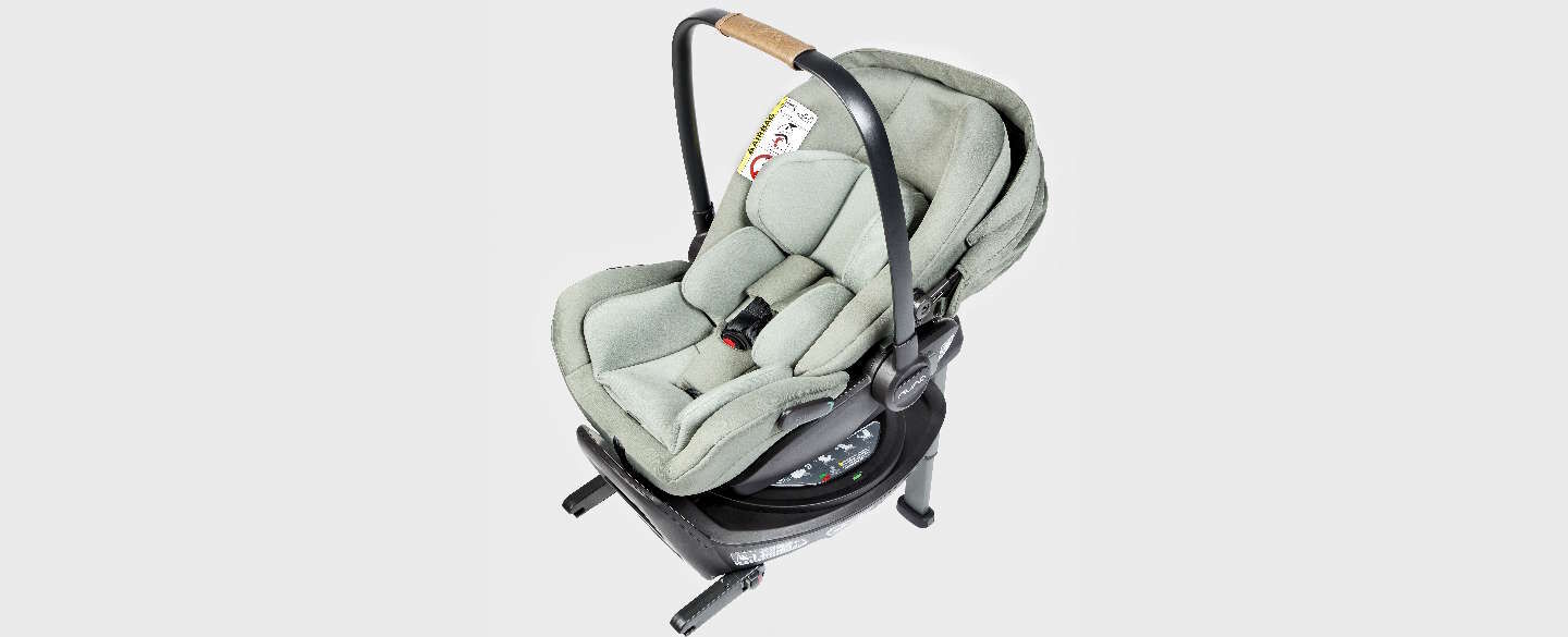 Babyschale mit Isofix-Basis, auf der sich der Sitz einfach und stabil montieren lässt. Die mitgelieferte Basis kann, einmal montiert, im Fahrzeug verbleiben. Zur Sicherung von größeren Babys kann die Schale auch im Auto gelassen und zum leichteren Hineinheben und Anschnallen zur Seite gedreht werden.
