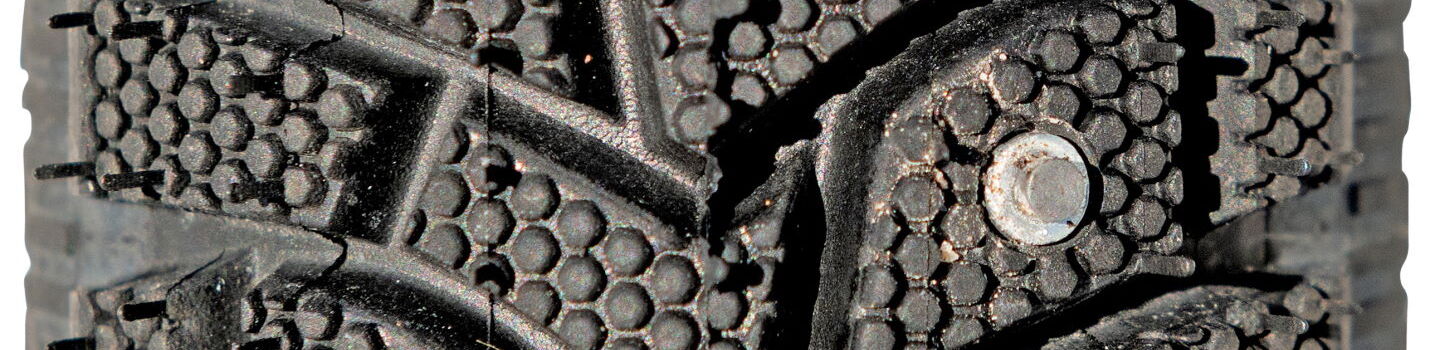 Spikereifen mit feinem Stollenprofil und 200 Spikes, seitlicher Reflektorenstreifen.