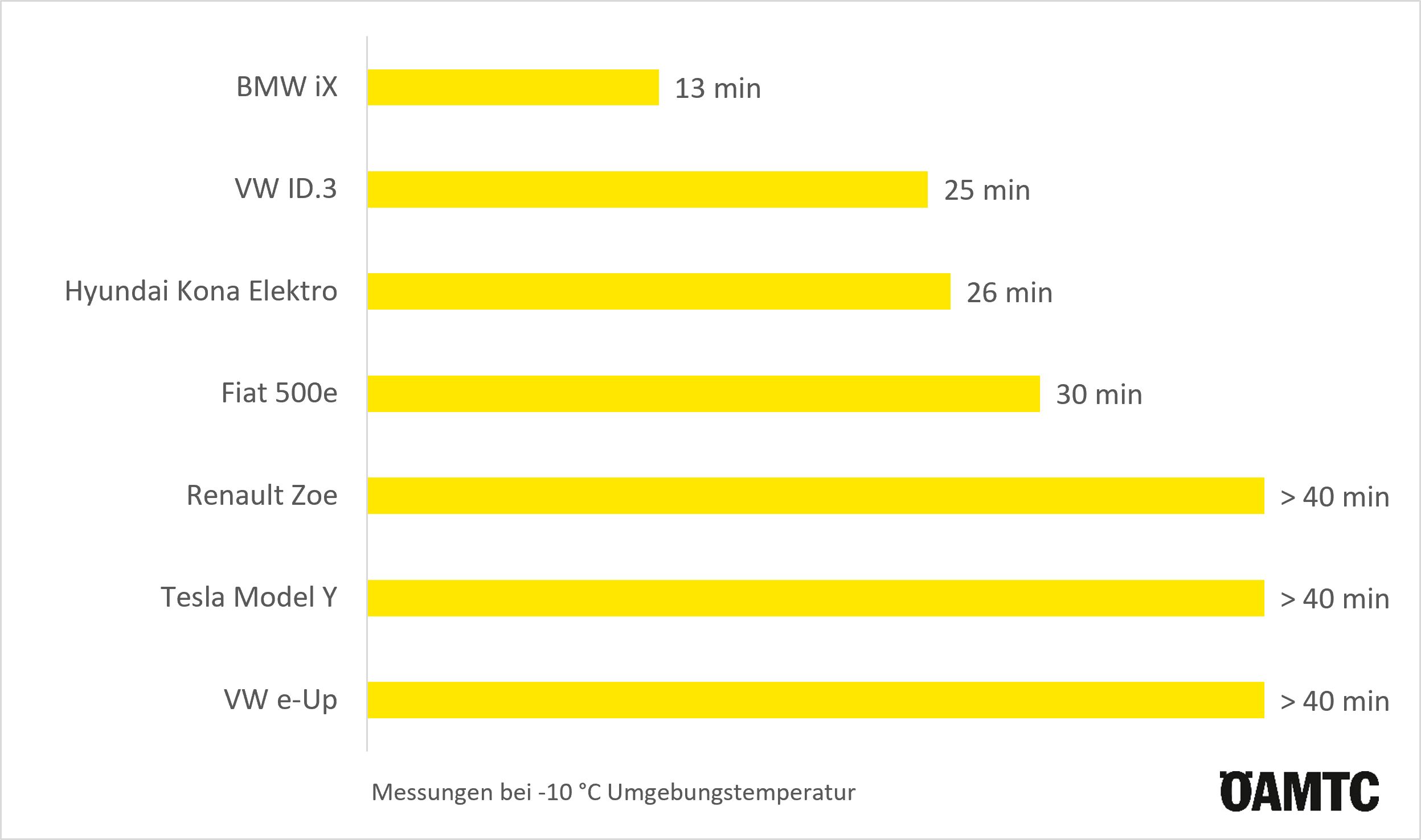 Bei den Ergebnissen zur Aufheizdauer zeigten sich teils deutliche Unterschiede: Das größte Testfahrzeug, der BMW iX, erreichte trotz seiner geräumigen Fahrgastzelle die Zieltemperatur von 20 °C schon nach rund 13 Minuten. Die beiden Kompakten VW ID.3 und Hyundai Kona Elektro brauchten bereits doppelt so lang: rund 25 Minuten. Der kleine Fiat 500e benötigte sogar etwas mehr als 30 Minuten, um den Innenraum auf 20 °C aufzuheizen.