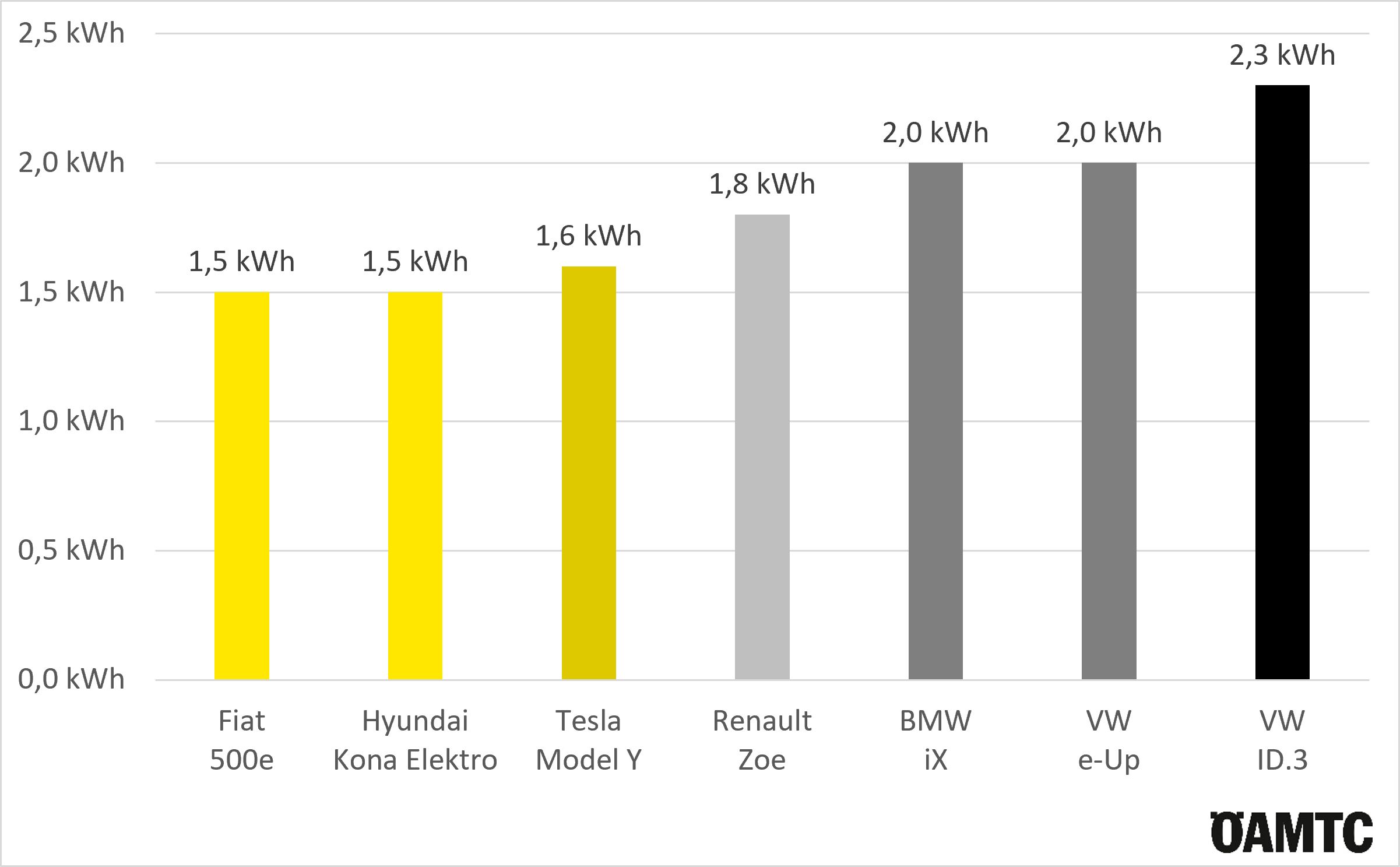 Beim Energiebedarf, der zum Erwärmen des Innenraums auf 20°C (lt. Bordcomputer) benötigt wurde, gab es teils deutliche Unterschiede. Sowohl der Fiat 500e als auch der Hyundai Kona Elektro benötigten hierfür die geringste Energiemenge mit jeweils 1,5 kWh. Das Tesla Model Y benötigte mit 1,6 kWh nur unwesentlich mehr Energie. Der Renault Zoe brauchte 1,8 kWh aus der Batterie für die Aufheizung auf 20 °C. Interessante Ergebnisse zeigten sich beim mittlerweile in die Jahre gekommenen VW e-Up: Dieser benötigte trotz kleinem Innenraum exakt gleich viel Energie, wie der deutlich größere BMW iX, nämlich 2,0 kWh. Den höchsten Energiebedarf im Testfeld hatte der VW ID.3 mit 2,3 kWh.