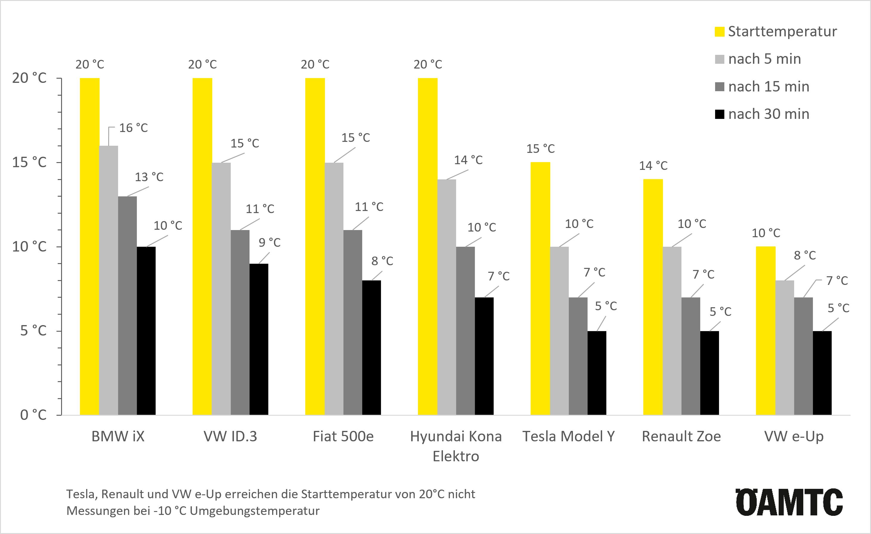 Der ÖAMTC hat gemeinsam mit seinen Partnern im Zuge einer Studie ermittelt, wie energie- und zeiteffizient Elektroautos heizen, wie viel Heizleistung für das Halten der Temperatur nötig ist und wie lange die Wärme im Innenraum gehalten werden kann. Dafür wurden umfassende Messungen am Klimaprüfstand bei einheitlichen -10 °C Umgebungstemperatur auf behagliche 20 °C Fahrgastzellentemperatur durchgeführt.