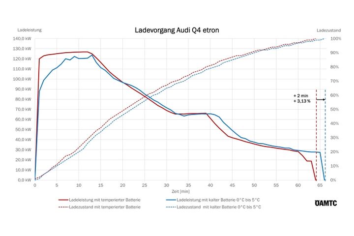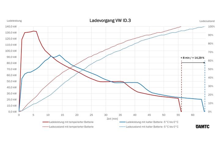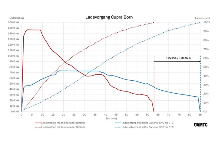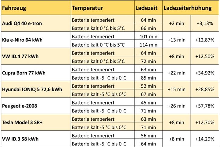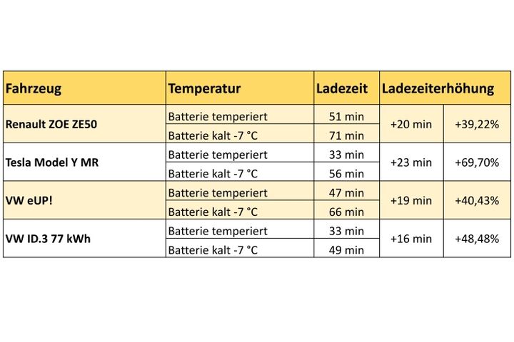 Die Untersuchung der Ladevorgänge an den ausgewählten Elektrofahrzeugen zeigt, dass sich vor allem der Einfluss tiefer Temperaturen wesentlich auf die Ladeeigenschaften auswirkt. Temperaturen um den Gefrierpunkt, wie sie in Österreich in den Wintermonaten häufiger auftreten, machten sich bei allen getesteten Fahrzeugen in Form einer Ladezeiterhöhung bemerkbar. Bei manchen Fahrzeugen hielt sich diese höhere Ladezeit durch eine zumeist verbaute intelligente Batteriekonditionierung in Grenzen. Andere Modelle hingegen haben zur Schonung der Traktionsbatterie die Leistungsaufnahme deutlich reduziert, wodurch Ladezeiterhöhungen von bis zu knapp 30 Minuten festgestellt werden konnten.