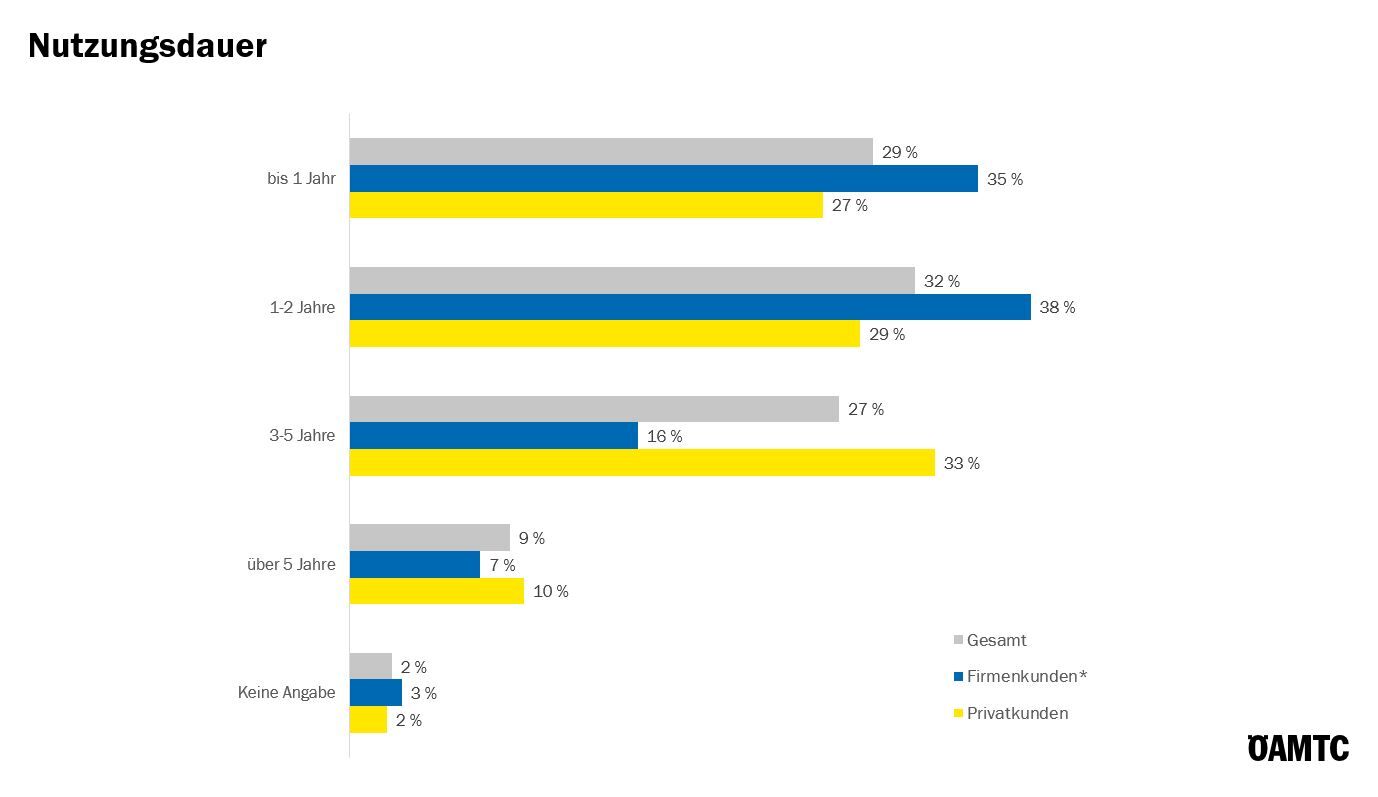 Der Großteil der Firmenkunden nutzt erst seit kurzem ein E-Auto (fast drei Viertel bis 2 Jahre).