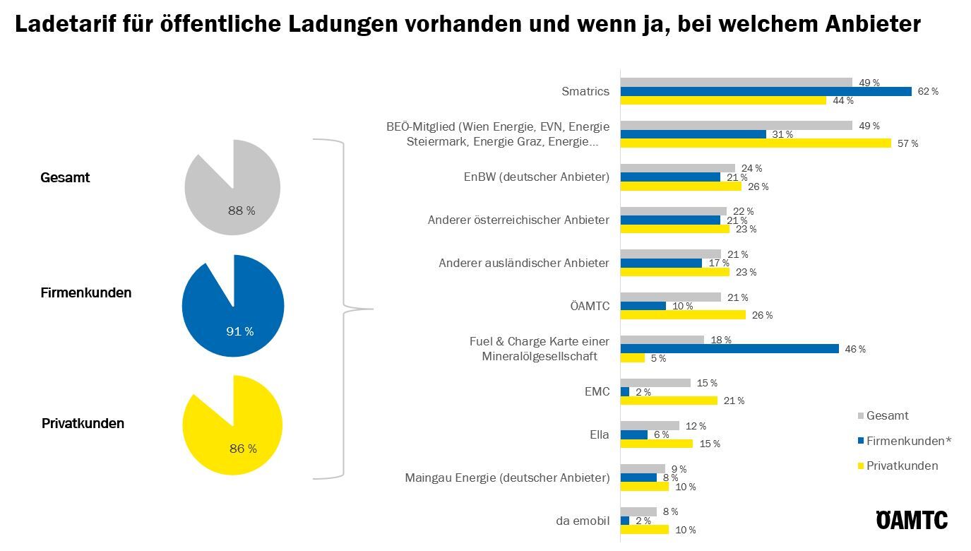 Fast 9 von 10 Befragte nutzen eine Ladekarte bzw. Lade-App, v.a. von Smatrics (öfter Firmenkunden) bzw. einem BEÖ-Mitglied (öfter Privatkunden). Eine Fuel & Charge Karte wird von fast der Hälfte der Firmenkunden genutzt.