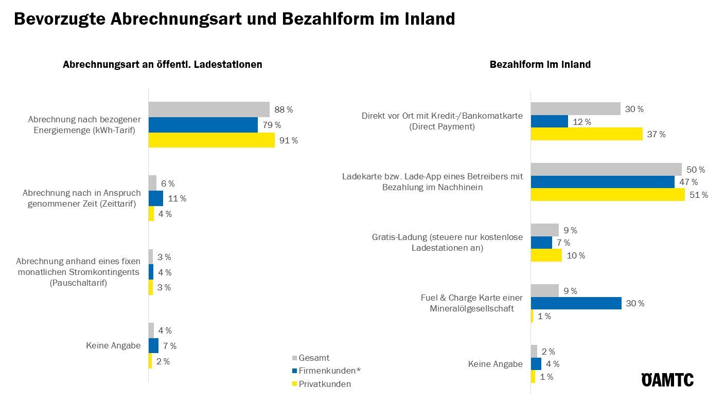 Der Großteil (88 %) bevorzugt die Abrechnung nach bezogener Energiemenge (kWh-Tarif). Privatkunden ziehen im Inland eine Ladekarte/-app bzw. direkte Bezahlung vor Ort vor, Firmenkunden bevorzugen eine Ladekarte/-app bzw. Fuel & Charge Karte.