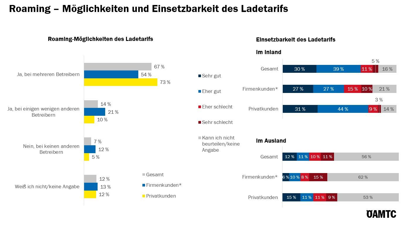 Zwei Drittel haben die Möglichkeit für Roaming bei mehreren Betreibern, Privatkunden öfter. Die Einsetzbarkeit der Ladekarte für Roaming wird im Inland als gut empfunden, im Ausland etwas schlechter, hier kann mehr als die Hälfte aber keine Beurteilung abgeben.