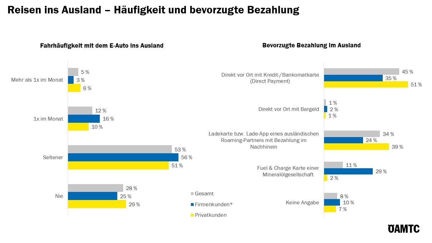 7 von 10 sind mit dem E-Auto auch im Ausland unterwegs, mehr als die Hälfte seltener als 1x im Monat. Privatkunden bevorzugen im Ausland eine direkte Bezahlung mit Kredit-/Bankomatkarte vor Ort bzw. Ladekarte/-app, Firmenkunden sind hier flexibler.