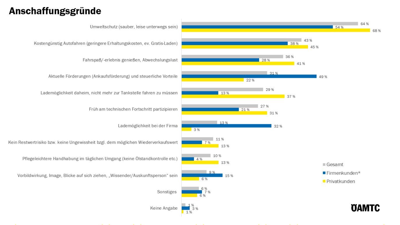 Umweltschutz steht für fast zwei Drittel im Vordergrund, gefolgt von kostengünstigerem Autofahren und Fahrspaß. Umweltschutz und Fahrerlebnis spielen für Privatkunden eine größere Rolle. Für Firmenkunden sind aktuelle Förderungen, steuerliche Vorteile und Lademöglichkeiten bei der Firma sowie auch die Firmen Car Policy ausschlaggebend.