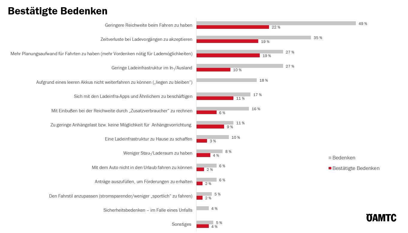 Die größten Bedenken haben sich auch am öftesten bestätigt (für ca. ein Fünftel): geringere Reichweite, Zeitverluste bei Ladevorgängen und mehr Planungsaufwand für Fahrten.