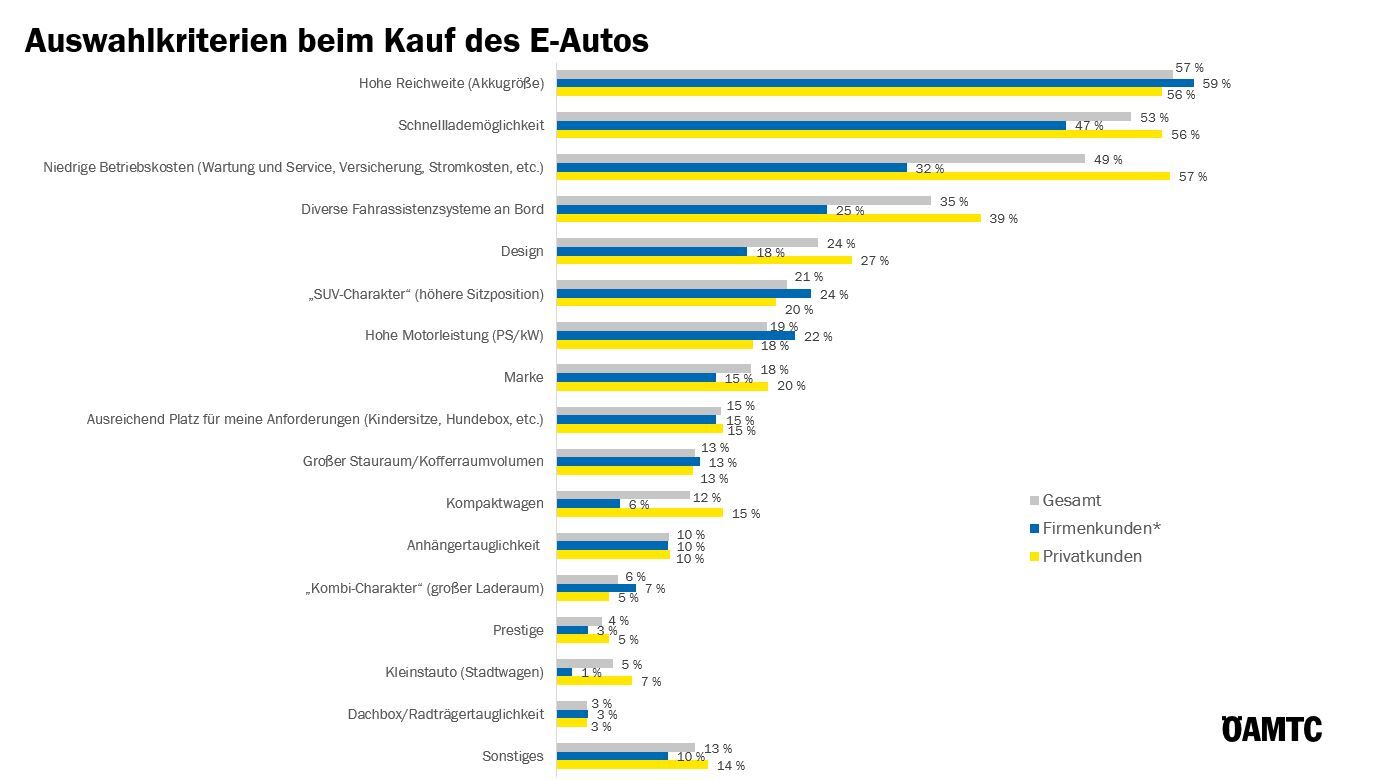 Hohe Reichweite, Schnelllademöglichkeit, niedrige Betriebskosten, Fahrassistenzsysteme und Design sind Top Auswahlkriterien. Privatkunden legen noch mehr Wert auf Schnelllademöglichkeit, niedrige Betriebskosten und Assistenzsysteme.