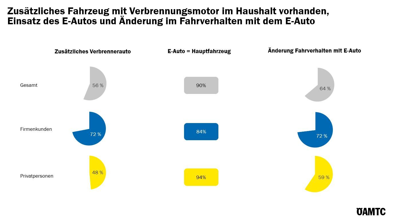 Mehr als die Hälfte (56 %) verfügt über ein zusätzliches Fahrzeug mit Verbrennungsmotor, Firmenkunden öfter als Privatkunden. Für den Großteil (9 von 10) ist das E-Auto Hauptfahrzeug. Fast zwei Drittel haben ihr Fahrverhalten geändert, Firmenkunden häufiger.