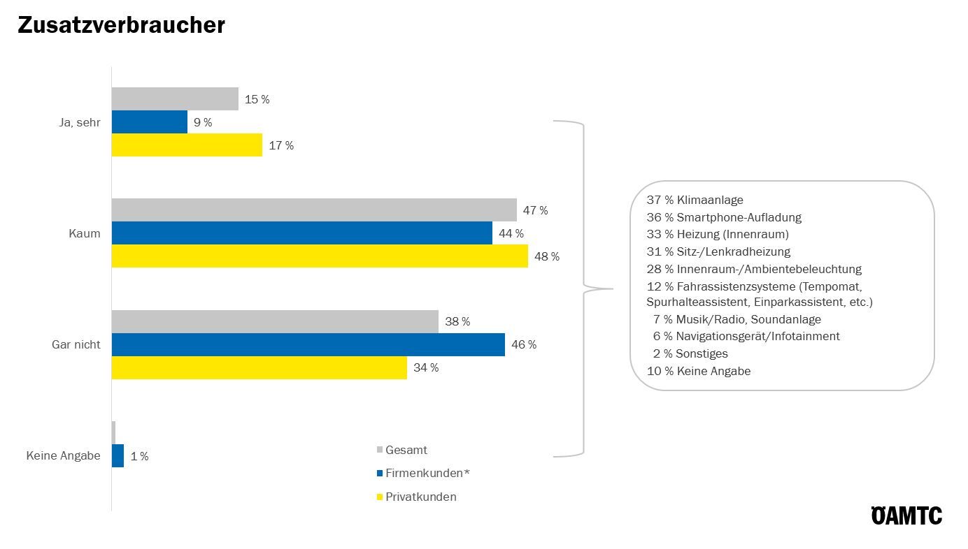 6 von 10 achten auf „Zusatzverbraucher“, aber nur 15 % sehr (Privatkunden etwas öfter). Eingespart wird vor allem bei Klimaanlage, Smartphone-Aufladung, Heizung und Innenraum-/Ambientebeleuchtung.