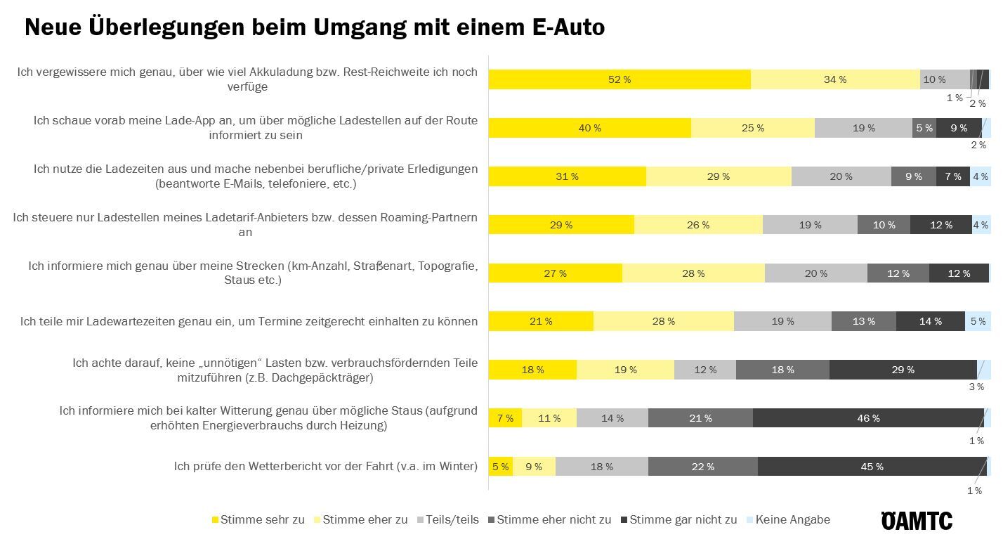 "Hauptverkehrsmittel der Befragten ist das Elektroauto, allerdings besitzen auch mehr als die Hälfte einen Verbrenner als Zweitauto. Häufigste Bedenken vor der Anschaffung eines E-Autos waren zu geringe Reichweite, Zeitverlust bei Ladevorgängen und damit verbunden ein großer Planungsaufwand", so ÖAMTC-Verkehrspsychologin Marion Seidenberger.