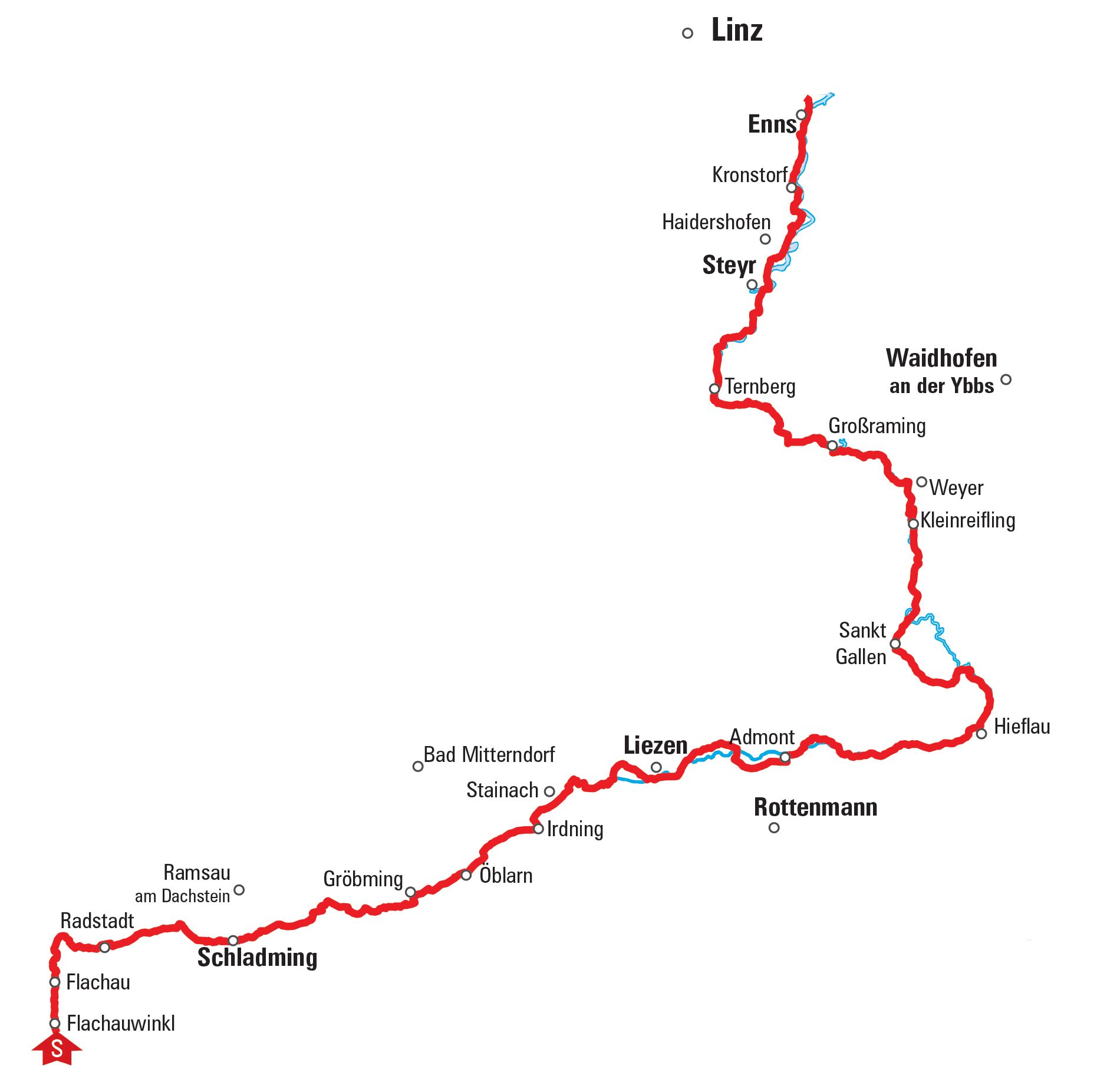 Die hügelige Tour ist mit einer Reihe anspruchsvoller Zwischenanstiege eine interessante Herausforderung zwischen beeindruckenden Bergkulissen, wildromantischen Tälern und tosenden Gewässern. Der Geheimtipp für Naturbegeisterte führt durch die Bundesländer Salzburg, Steiermark und Oberösterreich.