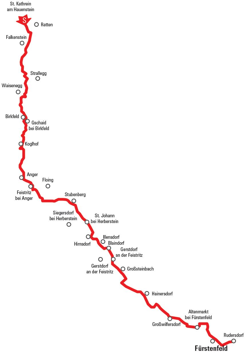 Wir starten in St. Kathrein am Hauenstein oder alternativ im benachbarten Ort Ratten. Die ersten Kilometer führt der Radweg auf der Trasse der ehemaligen Feistritztalbahn bergab durch schattige Wälder bis Birkfeld. Der Weg ist geschottert und so wird die Radtour zu einem wahren Naturerlebnis. In Birkfeld kann man einen Blick ins Schmalspurbahn-Museum werfen. Von Koglhof bis Steg (2 km vor Anger) kann man aber nur auf der stark befahrenen Bundesstraße fahren. Das historische Ortszentrum von Anger mit seiner wunderschönen Kirche und der romantischen Dorfplatz laden zu einer Rast ein. Der nun folgende Abschnitt zählt ohne Übertreibung sicherlich zu den schönsten Radwegen im Alpenraum. Tosendes Wasser, gewaltige Felswände und kühne Furten begleiten uns durch die Klamm. Am Ausgang der Klamm erwartet uns der Stubenbergsee, einer der beliebtesten Badeseen in Ostösterreich.