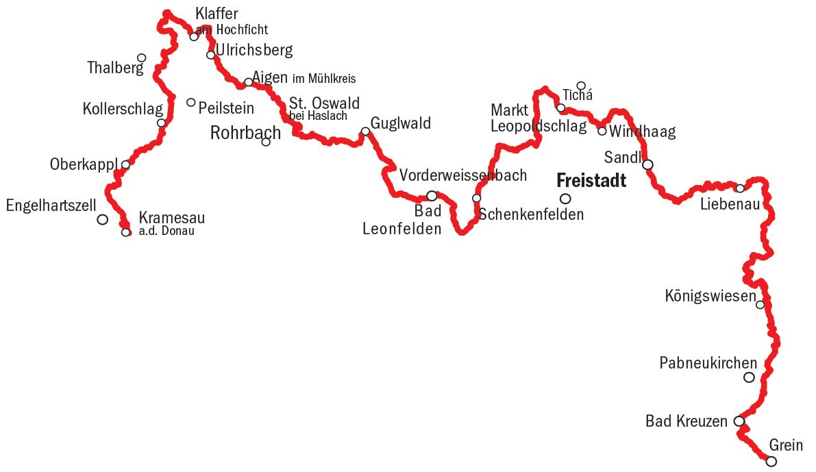 Die eher sportliche Route führt entlang der bayrischen und südböhmischen Grenze durch die geheimnisvolle und mystische Granitlandschaft des Mühlviertels. Geprägt ist diese naturintensive Tour von sanften Hügeln und dichten Wäldern.