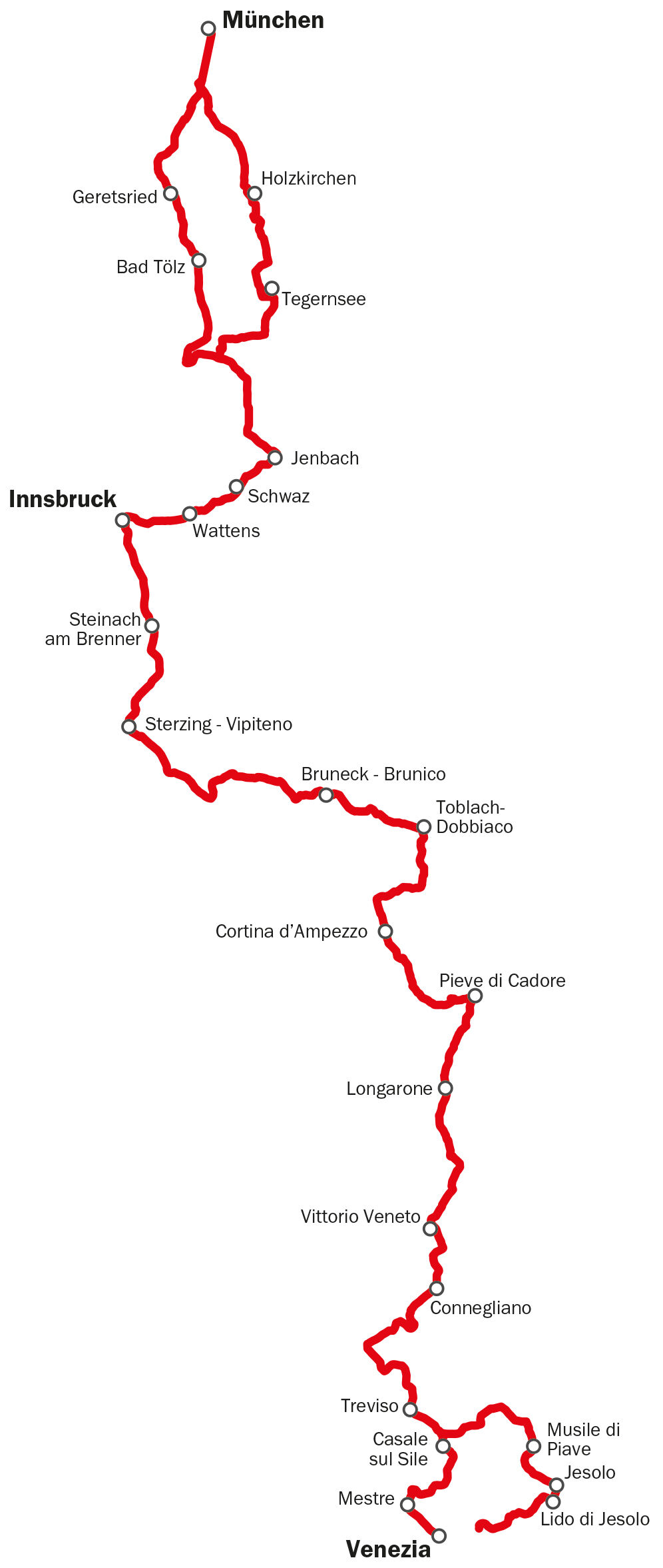 Strecke: bestehende Radwege und Nebenstraßen, steilste Steigungen auf den Achenpass, Brenner (kann mit dem Zug befahren werden) und Cimabanche/Gemärk vor Cortina d’Ampezzo.