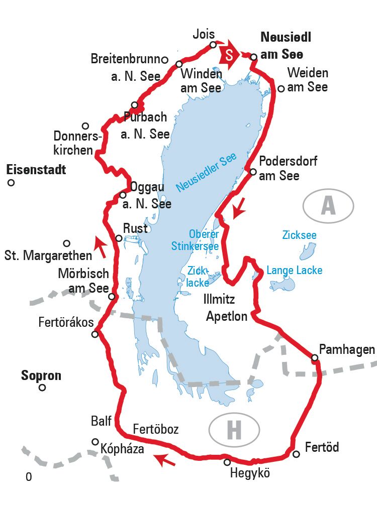 Von Neusiedl am See geht es über Weiden zur Ostseite des Sees und durch den Nationalpark Neusiedler See Seewinkel: vorbei an Mangalizaschweinen in Podersdorf am See, weißen Eseln beim Nationalparkzentrum in Illmitz und Graurindern in Apetlon. Der sogenannte „Seewinkel“ besticht durch die endlose Weite und Offenheit der Landschaft. Vom schrankenlosen Grenzübergang nach Ungarn in Pamhagen führt die Strecke über Fertöd – das Schloss Fertöd ist das ungarische Pendant zum Schloss Esterházy in Eisenstadt – Hidegség und Balf nach Fertörákos, wo wieder österreichisches Staatsgebiet befahren wird.