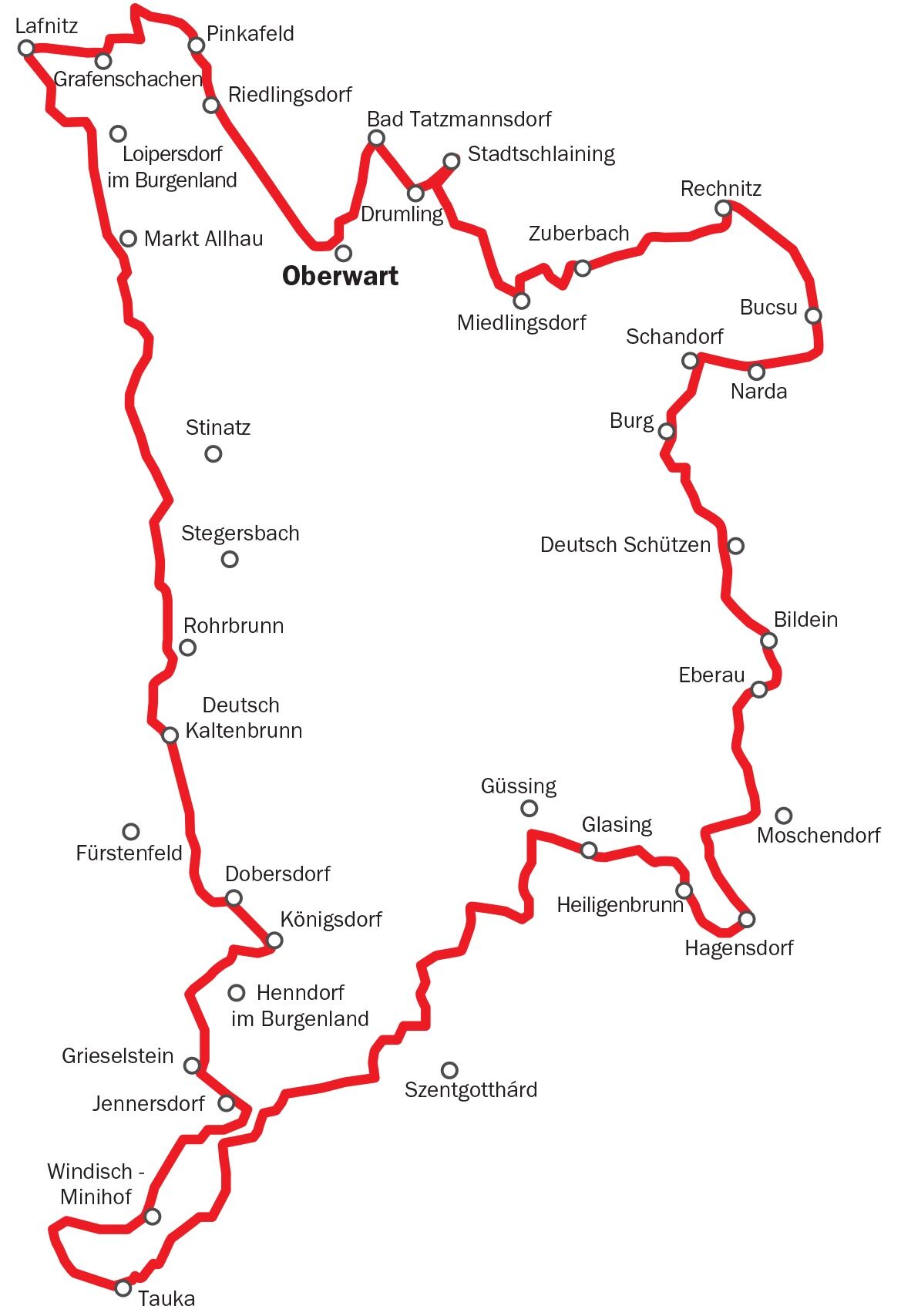 Start und Ziel: Rundkurs; als Startpunkt empfehlen wir Oberwart (Linienbusse aus Wien oder Graz) - oder Jennersdorf (Bahnhof)
