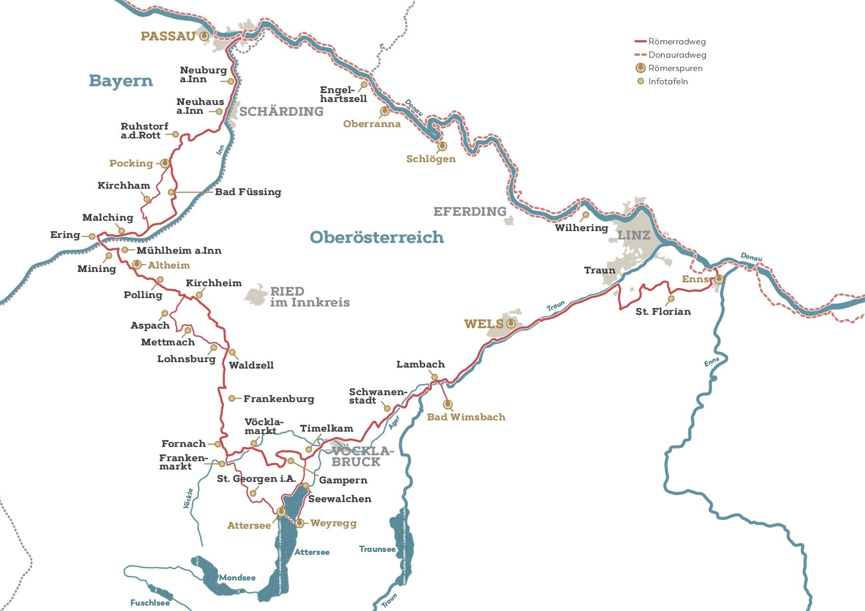 Der Römerradweg ist der familienfreundliche Weg in die Welt der Römer. Unterwegs mit der Römerspuren-APP folgt man den „Zeitzeugen“ auf moderne, dem Zeitgeist entsprechend sehr unterhaltsame Weise und es bleibt genug Zeit, sich um die eigene Gesundheit zu kümmern. Vorbei an vielen Fundstellen sowie interessanten Informationstafeln über das Leben in der Römerzeit, führt die Strecke von Passau aus über den Attersee und Wels bis nach Enns an die Donau.