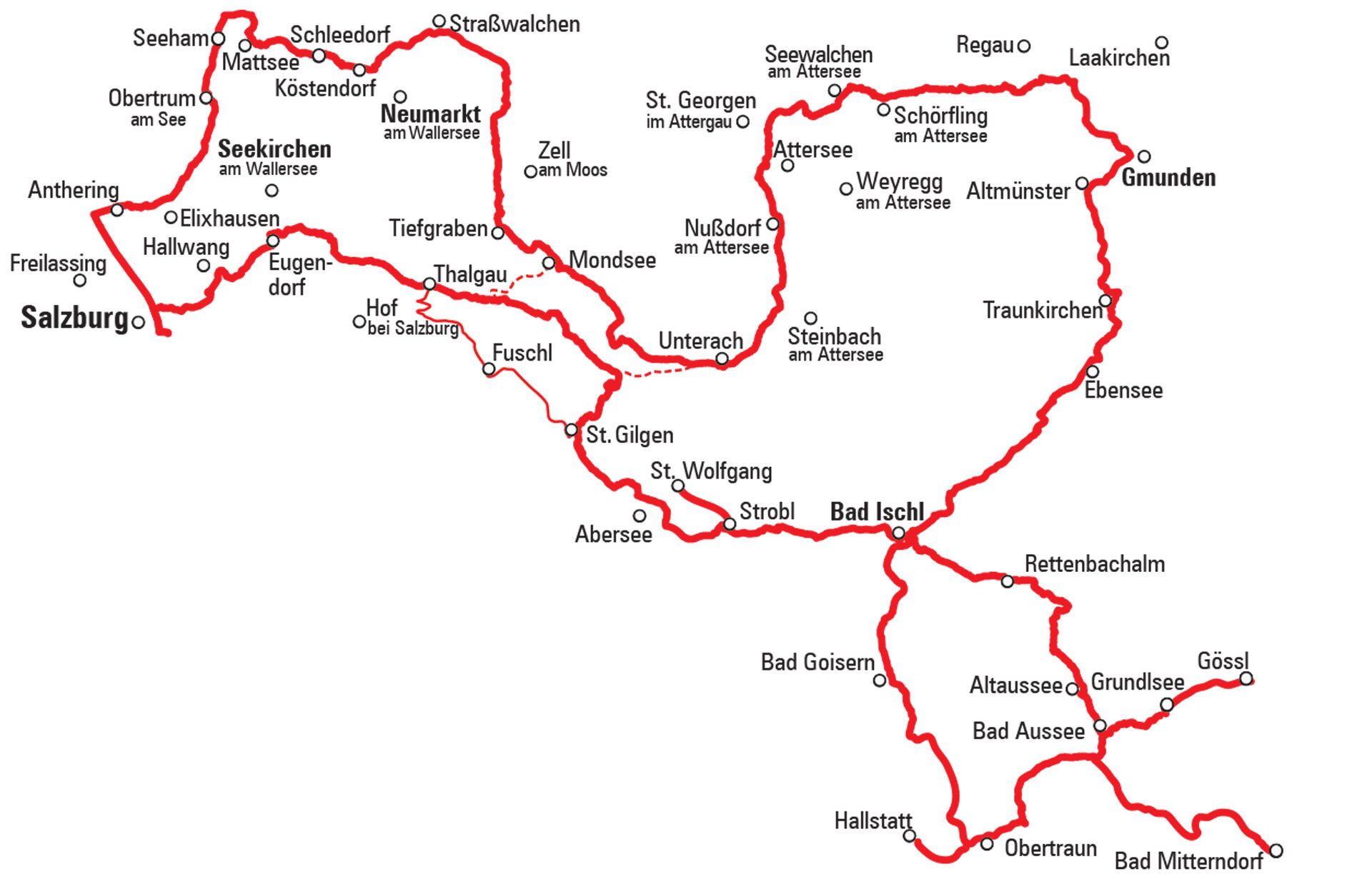 Wird die Festspielstadt Salzburg als Ausgangspunkt gewählt, fährt man zunächst auf der Trasse der historischen Ischlerbahn nach Eugendorf und weiter ins Mozartdorf St. Gilgen, nach St. Wolfgang und schließlich in die berühmte Kaiserstadt Bad Ischl. Der Besuch der Kaiservilla im Kaiserpark, des Stadtmuseums, der Therme oder der legendären Hofkonditorei Zauner sind Fixpunkte.