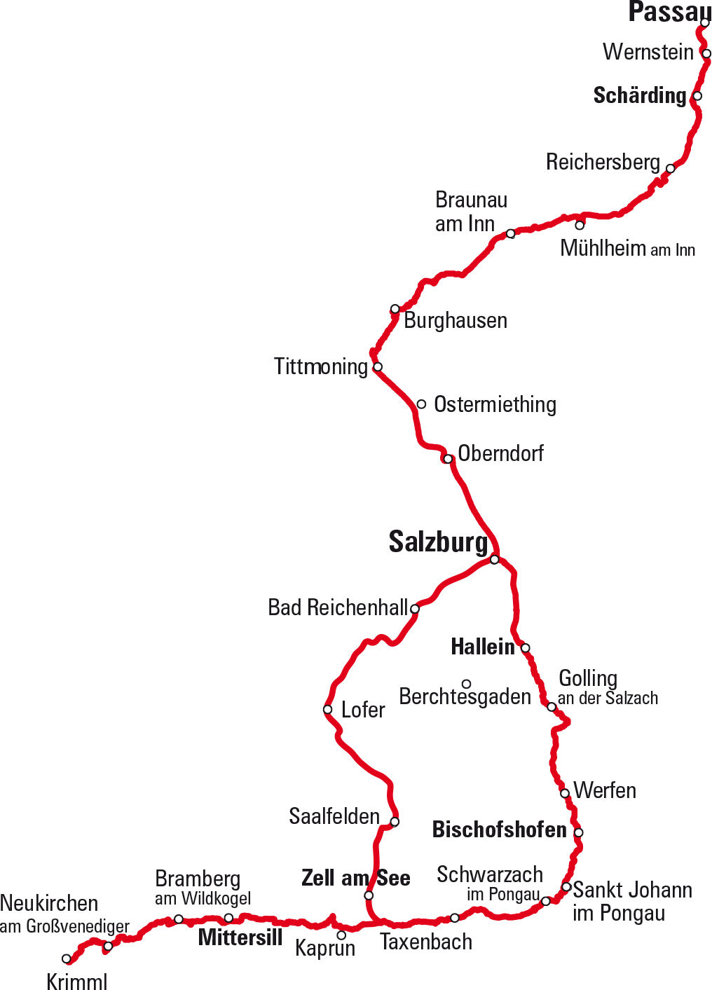 Kurzcharakteristik: Aufgrund des Gefälles meist leicht bergab, nur wenige Steigungen. Ca. 80% der Radroute sind geteert. 95% führen auf Radwegen bzw. verkehrsarmen Nebenstraßen. Für Familien gut geeignet ist vor allem die Variante durch das Saalachtal. Geeignet für Tourenräder und Trekkingbikes, für Rennräder gibt es eine eigene Variante..
