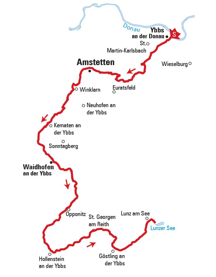 Die Ybbs, der grüne Faden entlang des Ybbstalradwegs, schlängelt sich durch eine abwechslungsreiche Landschaft vom milden bis zum wilden Mostviertel. Der Start in Ybbs beginnt gemächlich mit nur wenigen Steigungen. Richtung Amstetten ist ein kurzer Hügelrücken zu erklimmen, der die Radfahrer mit einem prächtigen Ausblick in die Ebene im Norden belohnt. Je weiter die Radroute Richtung wildes Mostviertel führt, umso ursprünglicher und spektakulärer wird der Ybbstalradweg. In Waidhofen an der Ybbs, geprägt von einem historischen Stadtkern und mittelalterlichen Wehranlagen, verbindet sich Natur mit städtischem Flair.