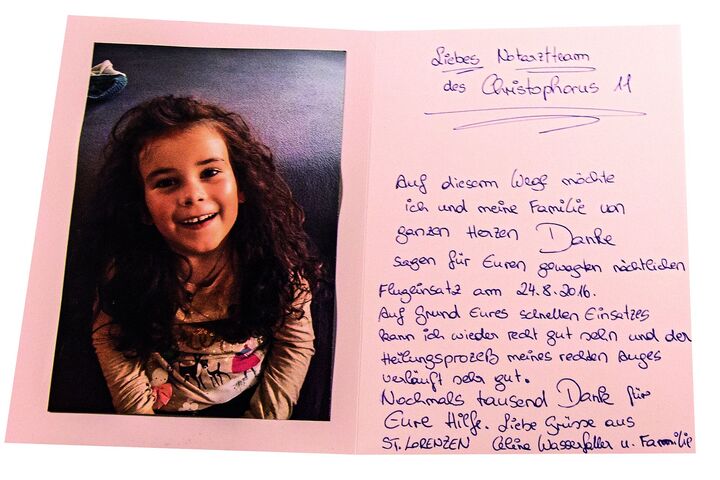 An den Flug zum Klinikum Klagenfurt kann sich Celine nicht erinnern. Die Ärzte hatten dem Kind Schmerzmittel verabreicht und die Augen verbunden. Mutter Kerstin erinnert sich an den Lärm, die Dunkelheit und ihre Angst um das Augenlicht ihrer Tochter. Vor allem aber war und ist sie froh über den rettenden Flug des großen gelben Schutzengels. „Im Klinikum standen schon sechs Doktoren bereit und haben Celine sofort operiert“, erzählt sie dankbar.