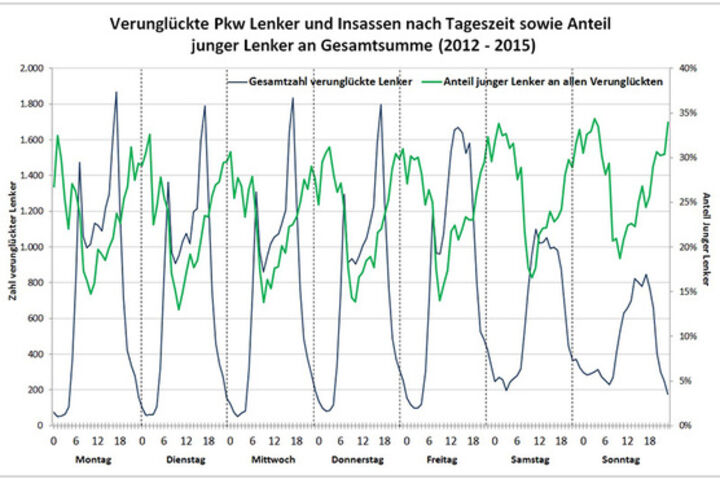 Im Jahr 2015 verunglückten rund 4.900 Pkw Lenker in der Altersgruppe der 17 bis 24-jährigen bei Unfällen auf Österreichs Straßen, davon verloren 36 ihr Leben. Eine aktuelle Analyse des ÖAMTC ergab, dass vor allem in den Nachtstunden am Wochenende der Anteil der verunglückten jungen Lenker erhöht ist. In dieser Zeit ist sogar jeder dritte Getötete ein Jugendlicher. Dennoch ist die Entwicklung der Unfallzahlen der letzten Jahre grundsätzlich positiv. Der Anteil der jungen Lenker an allen bei Pkw Unfällen verunglückten Lenkern ist gesunken, denn im Jahr 2000 waren es 34 Prozent, im Jahr 2015 nur noch 26.
