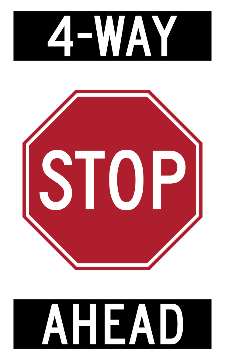 An dieser Kreuzung haben alle Straßen ein Stoppschild. Das zuerst kommende Fahrzeug hat Vorrang (im Zweifel gilt rechts vor links).