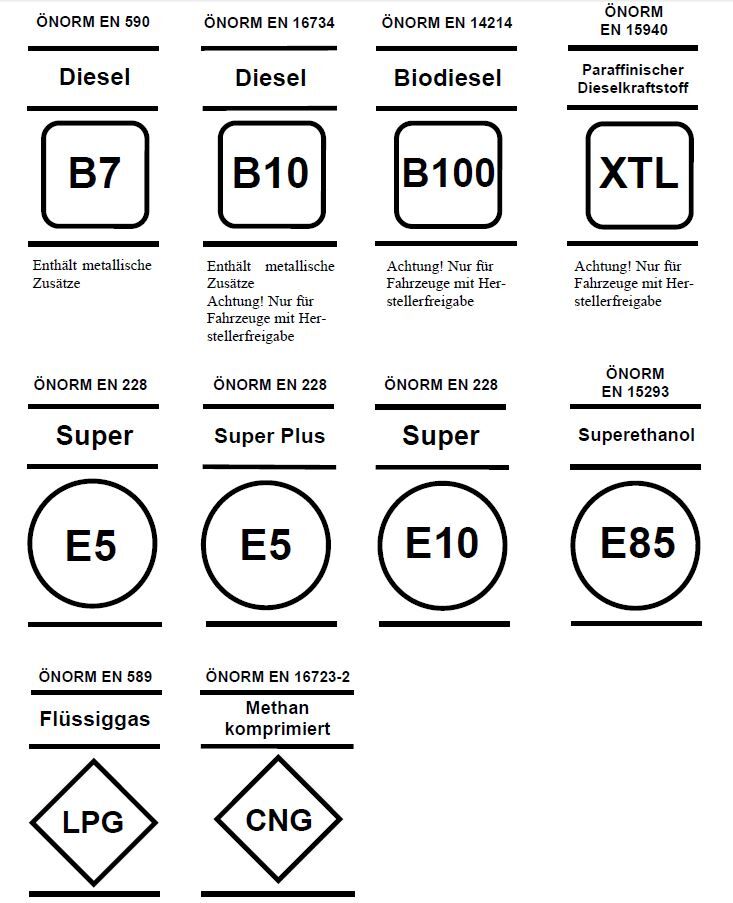 Die Aufkleber weisen die genormte geometrische Erkennungsform für Benzin und Diesel auf und beinhalten im Zentrum jeweils die Bezeichnungen E5 bzw. B7. Dies entspricht den max. Biokraftstoffanteil von in Österreich erhältlichen Benzin- und Diesel Kraftstoffen. Grundsätzlich sind alle Fahrzeuge mit diesem je Kraftstoffart max. beigemengten Biokraftstoffanteil verträglich. Neuere Fahrzeuge können durchaus auch mehr Biokraftstoffanteil (z.B: Benzin mit max. 10% Bio-Ethanol Anteil -> Kennzeichnung E10) vertragen, sind im Regelfall jeweils aber bereits vom Fahrzeughersteller gekennzeichnet und freigegeben.