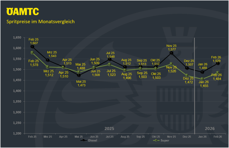 Stand 3.3.2026: Die Preissteigerungen im Februar – plus 4,1 Cent bei Diesel auf 1,529 Euro und plus 2,9 Cent bei Super auf 1,484 Euro – erwiesen sich bereits als Vorboten der aktuellen Entwicklungen im Nahem Osten. Mit Beginn der Kampfhandlungen im und um den Iran setzte sich der Aufwärtstrend Anfang März deutlich fort. Mit Stand 3.3.2026 kostete Diesel durchschnittlich 1,739 Euro, Super 1,639 Euro pro Liter. Binnen einer Woche entspricht das einer Erhöhung von 17 Cent bei Diesel und 12 Cent bei Super.