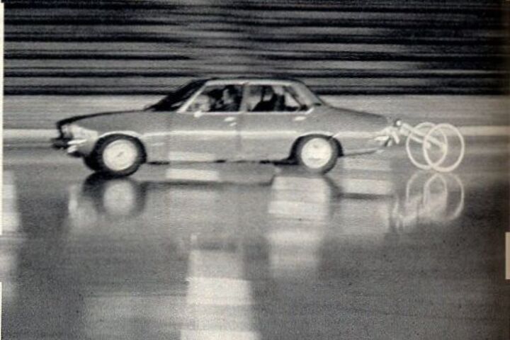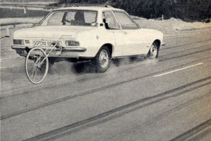 Um den Bremsweg zu ermitteln, wurde wie heute aus 100 km/h bis zum Stillstand gebremst. Natürlich ohne ABS. Damit das Fahrzeug dabei stabil in der Spur blieb, wurden ganz einfach die Bremskreise der Hinterachse deaktiviert. Eine Vollbremsung an der Vorderachse auf Asphalt oder Beton bedeutete: Bremsplatten. Die Reifen wurden „eckig“ und waren nicht mehr brauchbar – gleiches galt damals auch für Vollbremsungen im Alltag. Die Messtechnik war einfach: Stoppuhr, Maßband, ein analoger Windmesser, ein Dynamometer und ein „5. Rad“ – das berühmte „Peiselerrad“ – zur präzisen Erfassung der Fahrgeschwindigkeit.
