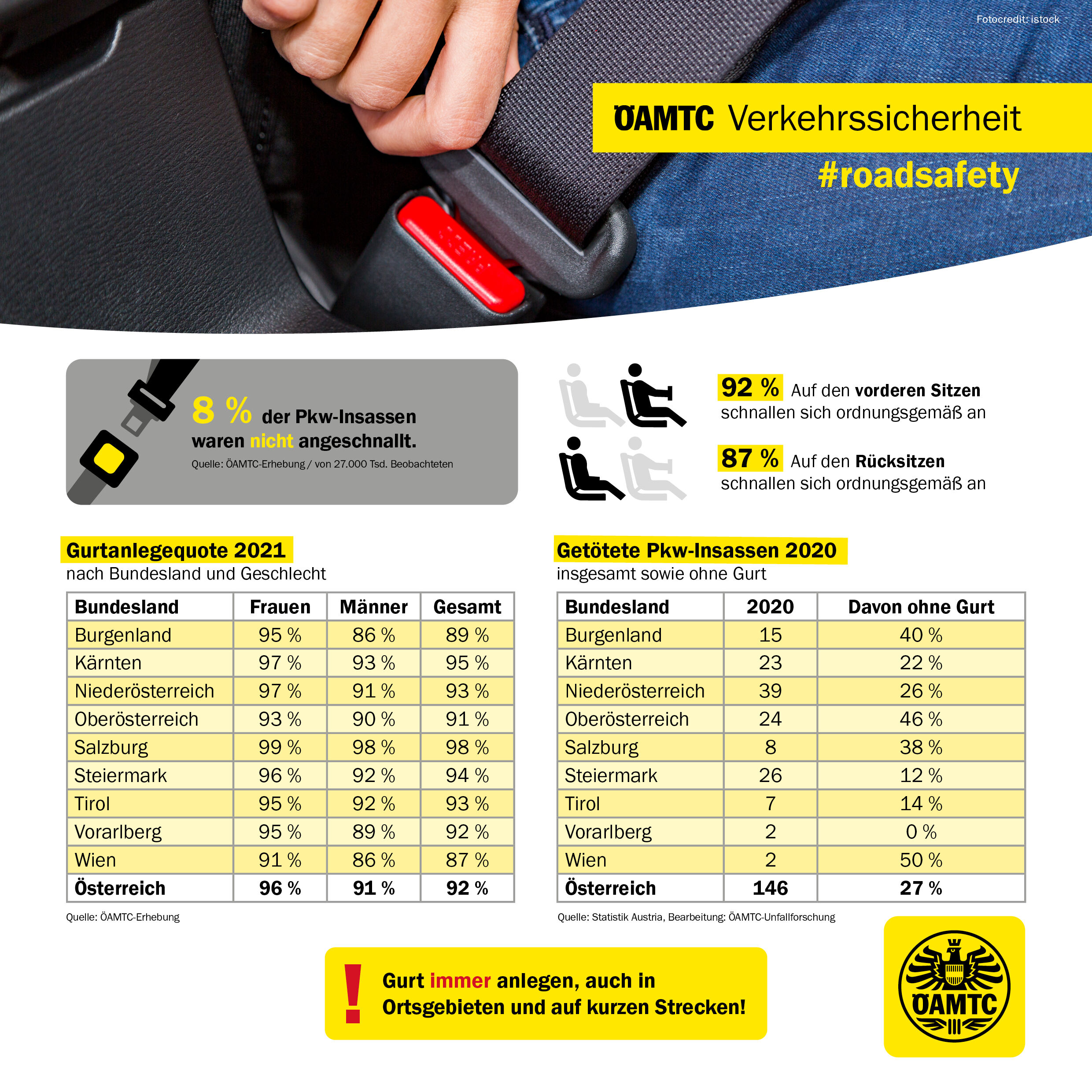 Zum Anlass der UN-Verkehrssicherheitswoche führte der Mobilitätsclub im Frühjahr 2021 eine Erhebung zur Gurtanlegequote unter erwachsenen Pkw-Insassen in allen Landeshauptstädten Österreichs durch. Das Ergebnis: Von über 27.000 beobachteten Insassen waren noch immer 8 Prozent nicht bereit, sich anzuschnallen. Das zeigt sich auch in den Unfallzahlen: Im Jahr 2020 kamen insgesamt 146 Auto-Insassen bei Verkehrsunfällen in Österreich ums Leben. Davon waren 27 Prozent nicht angeschnallt (Quelle: Statistik Austria).