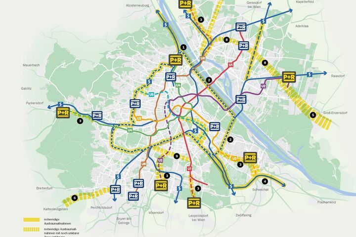 - Park&Ride: Neben den Gratis-Pkw-Abstellmöglichkeiten an Bahnhöfen im Umland braucht Wien auch (kostenpflichtige) P&R-Anlagen an Haupteinfallsrouten. Mit rund 20.000 zusätzlichen P&R-Stellplätzen können für rund 15 Prozent aller Pkw-Pendler:innen Abstellmöglichkeiten angeboten werden. An neuen U-Bahn-Endpunkten sowie an bestehenden Bahnlinien sollten daher P&R-Anlagen inklusive sicherer Radabstellmöglichkeiten mit guter Anbindung an das hochrangige Straßennetz errichtet werden. Zur Finanzierung sollten auch Mittel aus der Parkraumbewirtschaftung herangezogen werden.